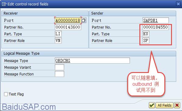 control record中的sender的partner profile可以随意填,除此之外都要填入真实的,下面填写的意思就是通过SAPDE1模拟发送一个outbound idoc到port A000000018中。