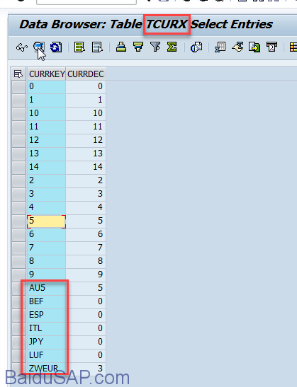 货币的小数位数是保存在表TCURX中的,正常的货币都是小数点后2位的,这个是默认的,不保存在这个表中,也就是凡是在表tcurx中找不到的货币的转换因子都是100 × 0.01 = 1,比如rmb。