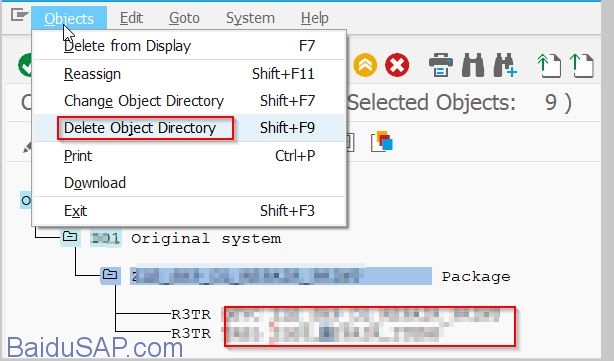 尽管我们已经在SAP系统内将这些对象删除,但是和package的关联关系还在,选中开发对象,点击delete object directory删除,如果提示被Transpot Request锁定,需要先将开发对像在TR中删除。